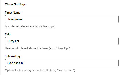 The Timer Settings section lets you control the text shown alongside the countdown on your product page. You can assign an internal label for easy management and customize the heading and supporting text that customers see.