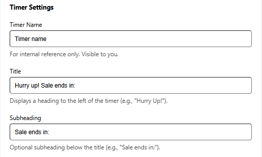 The Timer Settings section lets you control the text shown alongside the countdown on your website. You can assign an internal label for easy management and customize the heading and supporting text that customers see.