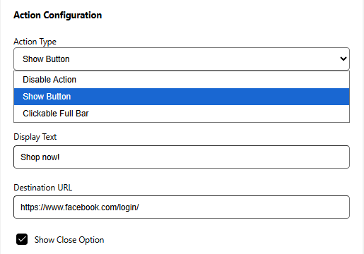 Destination URL (Available with Show Button & Clickable Full Bar)