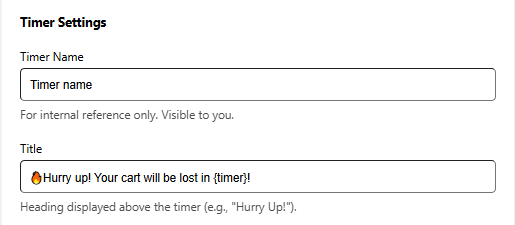 The Timer Settings section lets you control the text shown alongside the countdown on your cart page. You can assign an internal label for easy management and customize the heading and supporting text that customers see.
