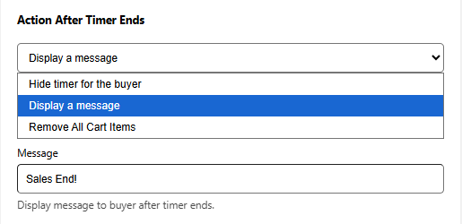Choose what should occur once the countdown finishes. This setting helps you control urgency and influence how shoppers behave at the final stage of checkout.